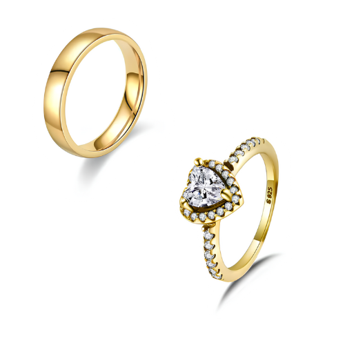 Zwei Ringe – ein Gefühl. Der eine schlicht und kraftvoll in Gold, der andere elegant geschwungen mit einem funkelnden Herz aus klarem Zirkonia. Zusammen erzählen sie von Vertrauen, Zusammenhalt und einem Versprechen, das glänzt.