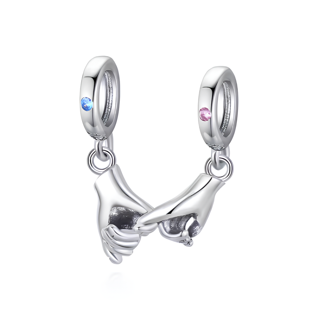 Zwei Hände, die sich festhalten – verbunden durch Liebe, Treue und ein stilles Versprechen. Mit rosa und blauem Zirkonia verziert, ist dieses Charm das perfekte Symbol für echte Nähe und tiefe Verbundenheit – ganz gleich, wo man gerade ist.
