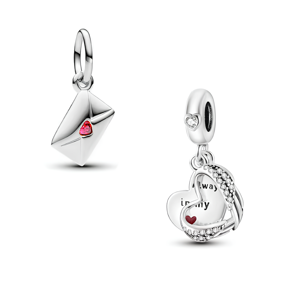 Zwei Symbole der Liebe, eingefangen in zartem Silber: Das “Letters of the Heart” Set erzählt eine Geschichte, die kein Brief je ganz erfassen könnte. Der eine Charm – ein versiegelter Liebesbrief mit Herzstein. Der andere – ein schützendes Herz, das flüstert: Always in my heart. Zusammen sind sie ein Versprechen für Nähe, auch in der Ferne.