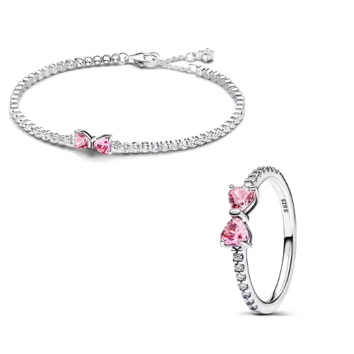 Ein Hauch von Verspieltheit, eingefangen in funkelndem Rosa. Dieses Set aus Armband und Ring verbindet klare Linien mit einer kleinen, aber wirkungsvollen Schleife. Zwei pinke Herz-Kristalle bilden das Zentrum des Designs – ein stilvoller Ausdruck von Leichtigkeit und Charme.