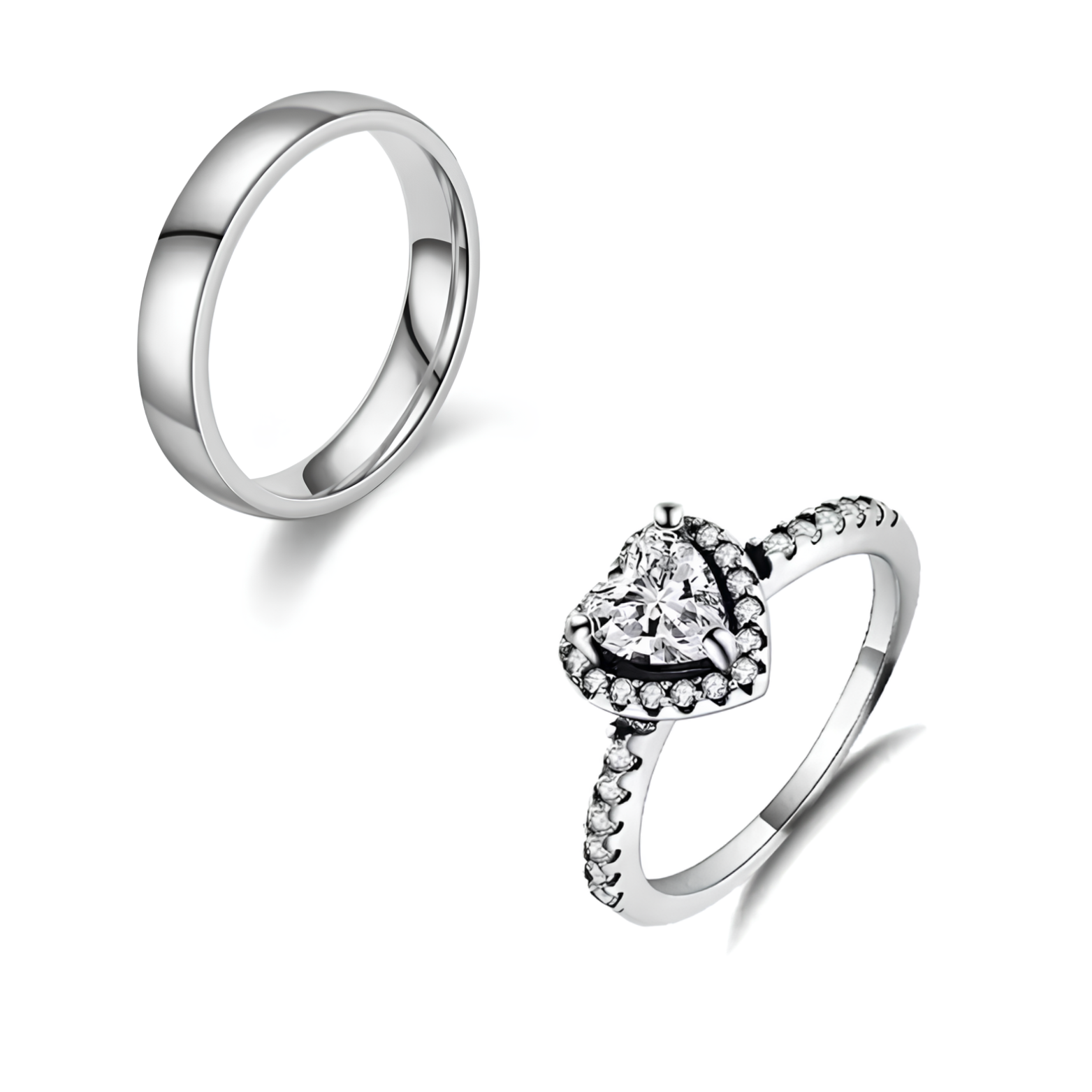 Der glänzende Bandring steht für Treue und Stärke, der Herzring mit seinem strahlenden Zirkonia-Herz für Zärtlichkeit und Gefühl. Gemeinsam erzählen sie eure Geschichte – ehrlich, zeitlos, unzerbrechlich.