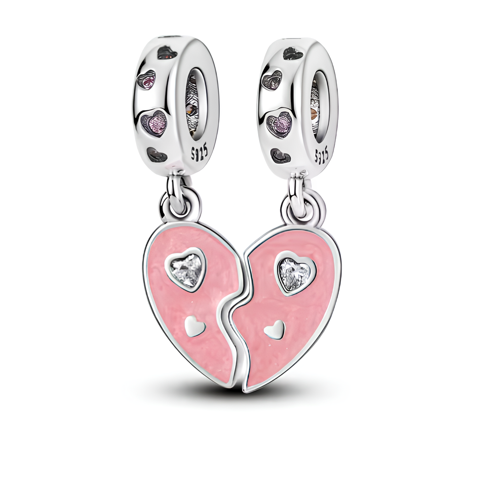 Dieser Charm Anhänger in Form eines zerbrochenen Herzens ist der perfekte Ausdruck von Verbundenheit und Liebe. Aus hochwertigem 925 Silber gefertigt, ist der Anhänger mit zarten rosa Emaille-Farben und funkelnden Zirkonia-Steinen verziert. Die zwei Hälften des Herzens verbinden sich zu einem vollständigen Symbol, das Liebe und Zusammengehörigkeit repräsentiert. Die Herzen auf den Riegeln und die Zirkonia-Steine fügen dem Design eine elegante und bedeutungsvolle Note hinzu.